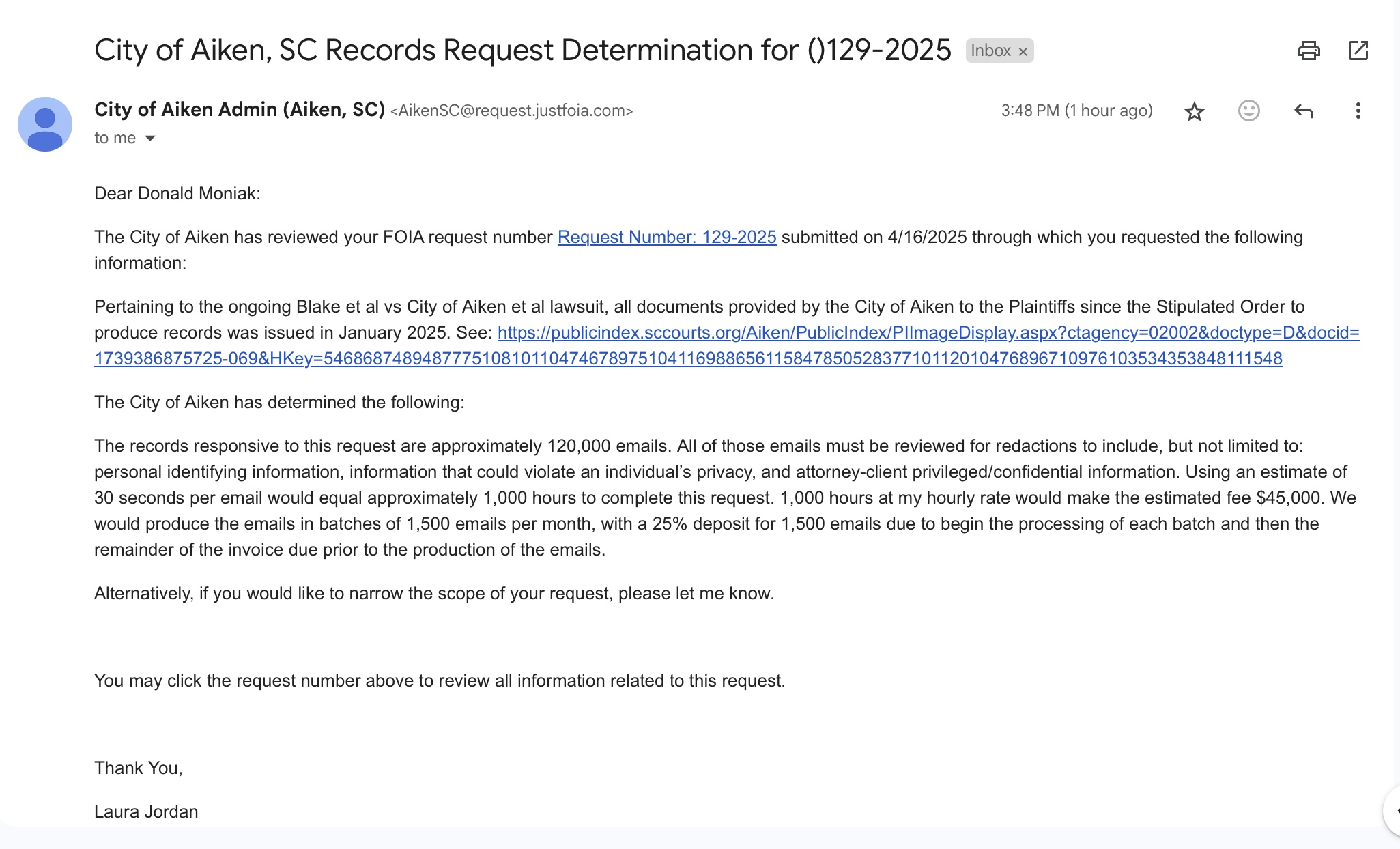 SINCE THIS ATION IS BY COURT ORDER, WHY WOULD THE CITY CHARGE FOR THESE DOCUMENTS? ALSO, PLEASE IDENTIFY THE INDIVIDUAL REFERRED TO AS “CITY”, “THEY”. ETC. TAXPAYERS OF AIKEN ARE ENTITLED TO KNOW EXACTLY WHO AND WHAT ARE THE INVOLVED FACTS OF THIS CASE.