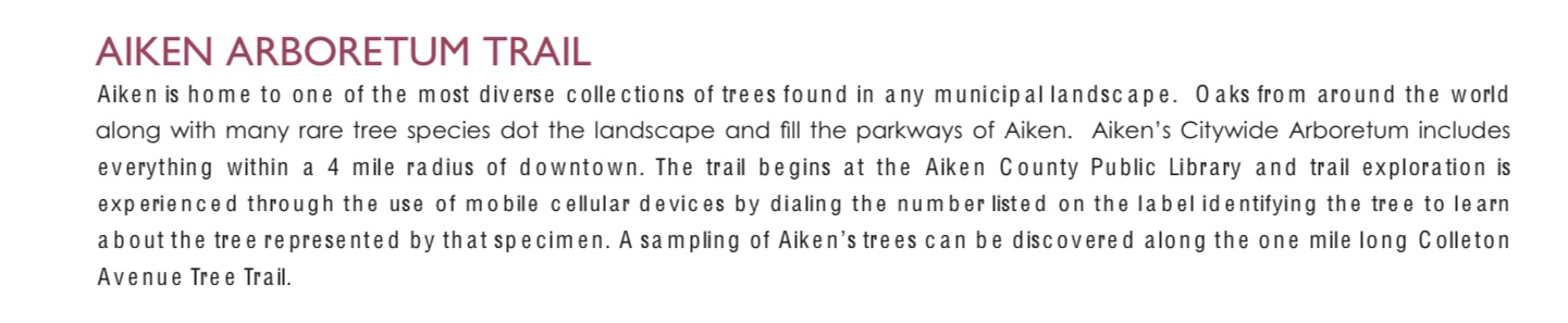 When the City of Aiken updated its Comprehensive Plan this year, the word “arboretum” remained absent from the final draft. After Aiken City Council approved that draft at the first Comprehensive Plan update public hearing on August 14th, Mr. McCartney brought the omission to the attention of City officials. Two weeks later, the Aiken Arboretum Trail was introduced as a Cultural Resource on Page 120 of the draft plan: