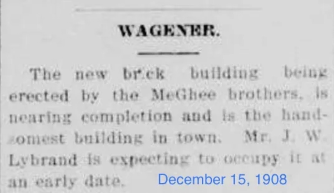Wagener Brick Building 1908 September 11, 2022 1070 × 620 McGhee & McGhee: Contractors and Builders, Civic Leaders: Part 1 of 3 McGhee & McGhee near completion on J.W. Lybrand store, “handsomest building in town.” December 15, 1908 Share this: Share on Facebook (Opens in new window) Facebook Share on Telegram (Opens in new window) Telegram Email a link to a friend (Opens in new window) Email